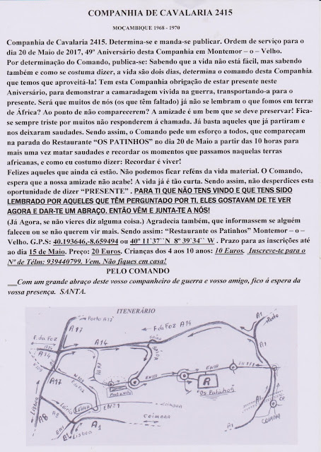 "20 de Maio 2017". Sabem que data é esta? Pois bem. É a data que marca o convívio da Companhia de Cavalaria 2415. Sendo assim, faço um apelo: Que todos participem nele. Que ninguém fique em casa. Todos aos "PATINHOS" em Montemor O velho no dia 20.