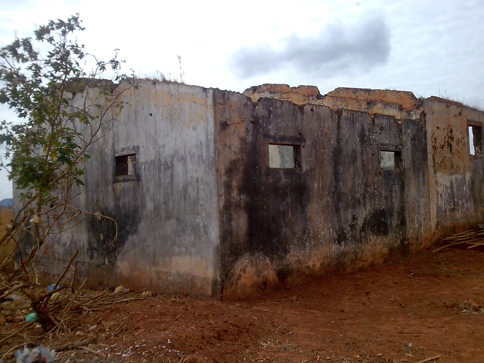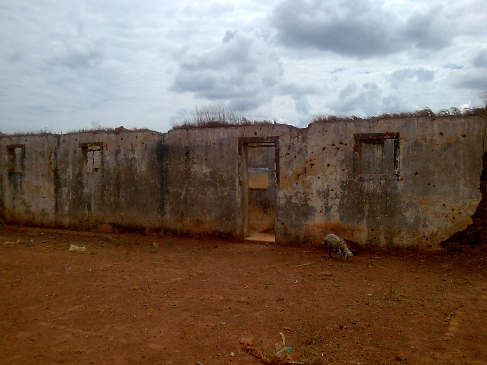 Ao fundo o aldeamento de Lione com algumas casas em tijolo e cimento. Á direita vislumbram-se as ruínas da caserna.