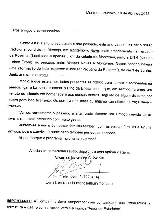 Carissimos Amigos; Desta vez nao ha a desculpa de que e longe.Praticamente todos residem na zona de Lisboa ou ja estao reformados e estao ja no Alentejo e Algarve.Aparece e leva algum camarada que nao tenha transporte.Um Abraço VIVALDO