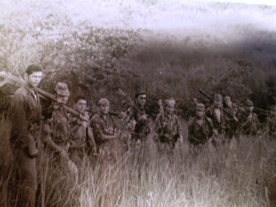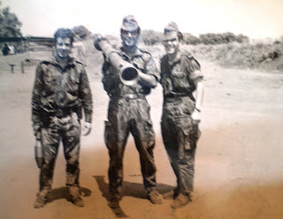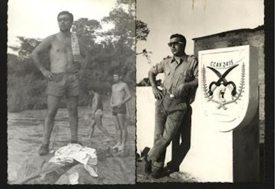 Quem se lembra desta história? Tudo isto se passou a caminho de Chala. Lembro-me vagamente (embora estivesse lá como a foto documenta), que tudo isto teve origem numa luta entre eles (Elefantes). Quem está com o machado na mão e o outro camarada que está atrás de mim, não sei quem é. Quem está de costas é o nosso camarada de saudosa memória (Joaquim Maluco) que infelizmente já não está no meio de nós. Era este o nome com que foi baptizado na companhia por ser um condutor destemido, a picada para ele era como se fosse uma auto-estrada! Também não sei qual foi o caminho que os dentes levaram, o que eu sei é que o ambiente não era nada bem cheiroso!